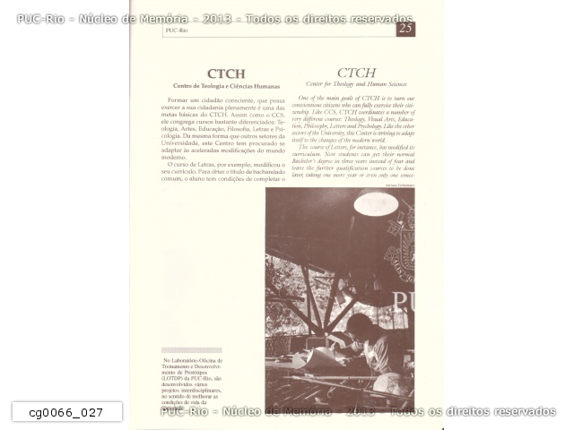 cg0066_027 | 1995 | p.25 - CTCH - No Laboratório-Oficina de Treinamento e Desenvolvimento de Protótipos (LOTDP) da PUC-Rio, são desenvolvidos vários projetos interdisciplinares, no sentido de melhorar as condições de vida da sociedade |