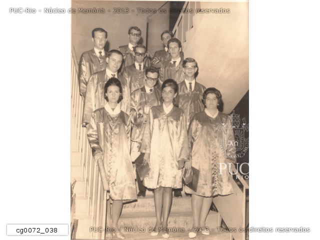 cg0072_038 | 1966 | Grupo de formandos em escada dos pilotis da PUC-Rio. |