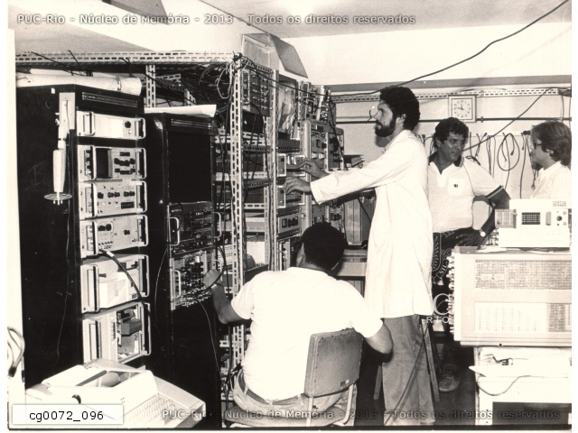 cg0072_096 | 1980 | Professores e técnicos em sala de controle de laboratório. |