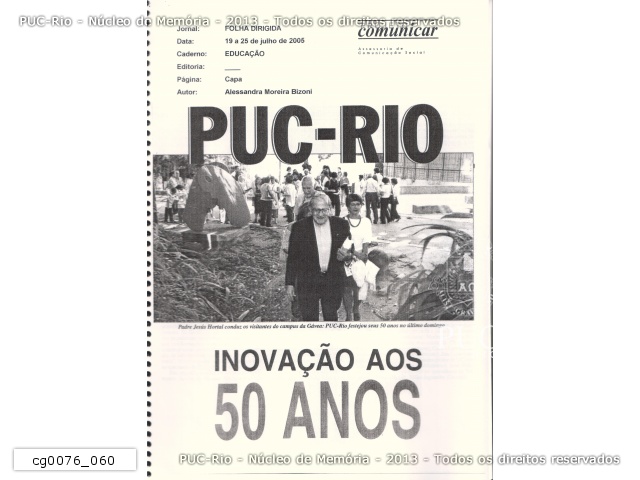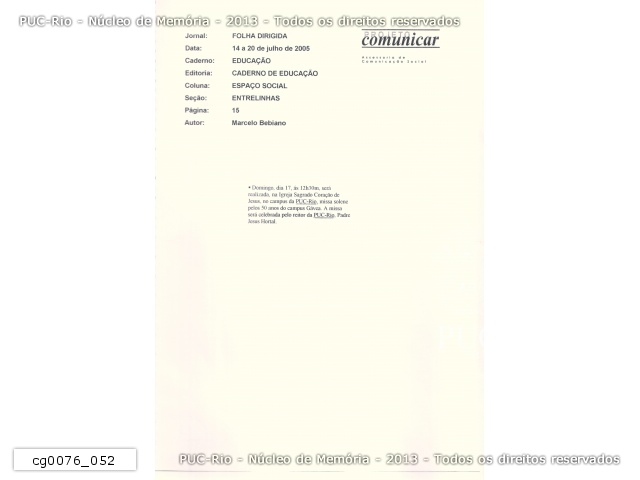 cg0076_052 | 14/7/2005 | Nota sobre a missa comemorativa dos 50 anos da PUC-Rio na Gávea no Caderno de Educação da Folha Dirigida de 14 a 20/07/2005. |
