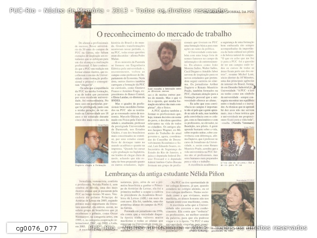 cg0076_077 | 17/7/2005 | Jornal da PUC - 50 anos campus Gávea. P.10 - "O reconhecimento do mercado de trabalho"; "Lembranças da antiga estudante Nélida Piñon". Com fotos. |