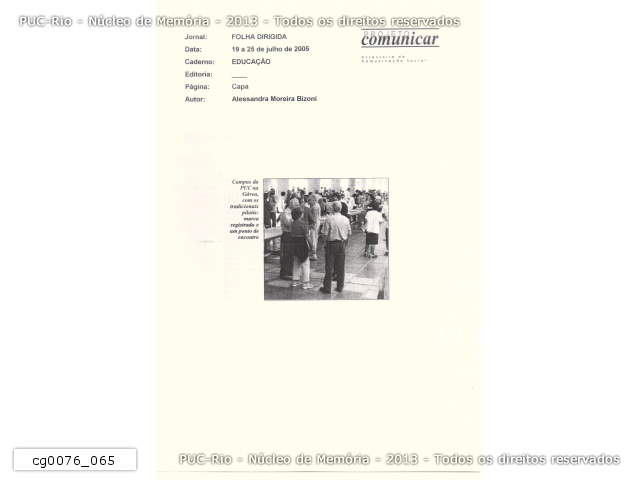 cg0076_064 | 19/7/2005 | Reportagem do Caderno de Educação da Folha Dirigida de 19 a 25/07/2005 sobre a PUC-Rio - "Gávea concentra todas as atividades acadêmicas". |