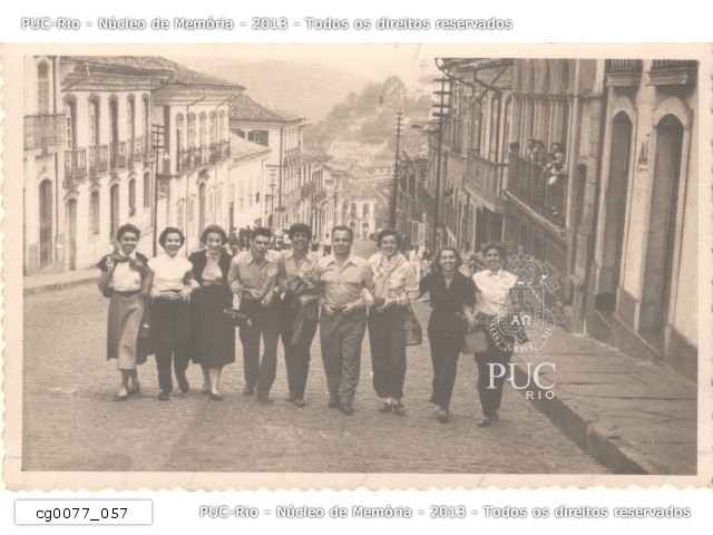 cg0077_057 | 9/1953 | Alunos dos cursos de Geografia e História da Faculdade de Filosofia em viagem a Ouro Preto. Alunas em calças compridas. |