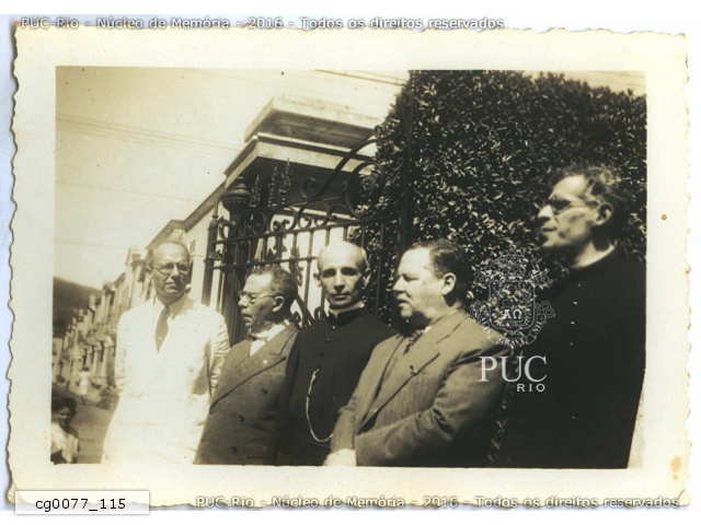 cg0077_115 | 1942 | Padre Franca no portão do Colégio Santo Inácio, ladeado por outros professores. |