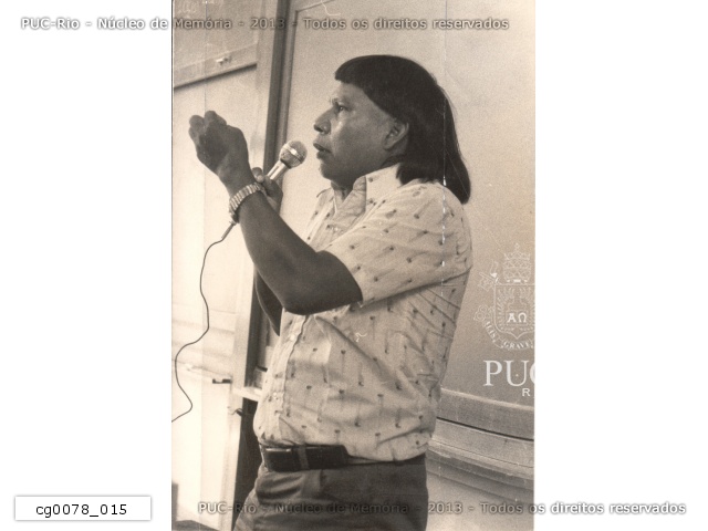 cg0078_015 | 8/10/1980 | Ex-Cacique Xavante, Mário Juruna, discursa no Auditório AQ-5 para a comunidade da PUC-Rio. Ele gravava com um gravador cassete todas as suas palestras, entrevista e encontros. Sempre comentava que o "homem branco mudava muito de palavra". |