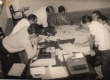 cg0078_052 | 1964 | Grupo trabalha em projeto, utilizando documentos, planilhas, apontador de lápis, máquinas de calcular e de escrever. No canto esquerdo uma apostila do IAG. |