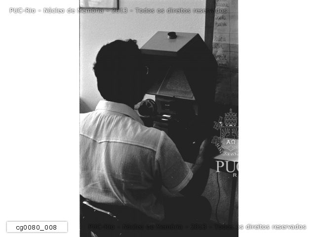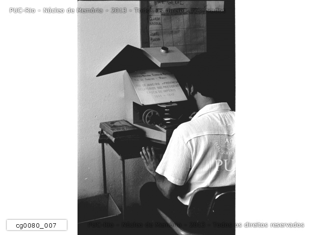 cg0080_008 | 1981 | O professor Afonso dos Santos na máquina de microfilme analisa documentos da pesquisa institucional do Departamento de História da PUC-Rio intitulada "Forças de segurança e ordem no Rio de Janeiro - 1822 a 1915", financiada pela Financiadora de Estudos e Projetos (FINEP). |