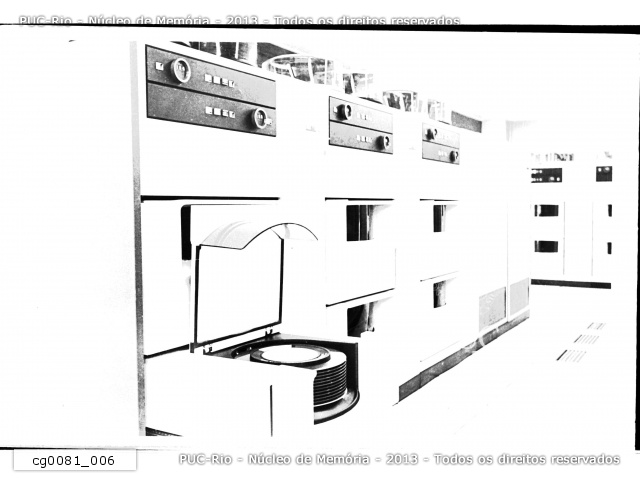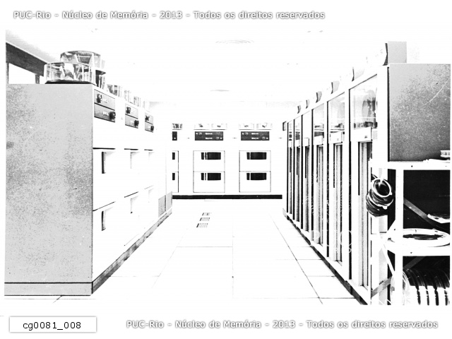 cg0081_008 | 1980 | À esquerda, recipientes dos discos rígidos; à direita, leitores de fitas magnéticas, necessários para o funcionamento dos computadores de grande porte do RDC. |