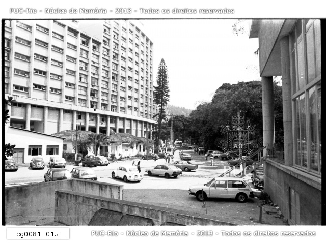 cg0081_015 | 1980 | Vista da entrada do campus. À direita, a Ala Frings, ainda com escada de madeira, e à esquerda, o Edifício Cardeal Leme. |