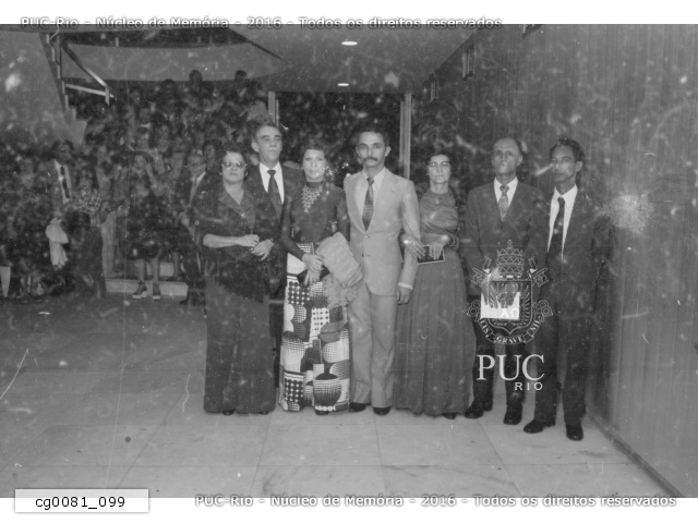 cg0081_099 | 1972 | Formandos e convidados posam para foto na cerimônia de colação de grau do Centro Técnico Científico da PUC-Rio. |
