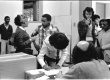 cg0081_083 | 1979 | Eleições para diretoria da Associação dos Funcionários da PUC-Rio. Funcionários conversam próximo aos elevadores da Ala Kennedy. |
