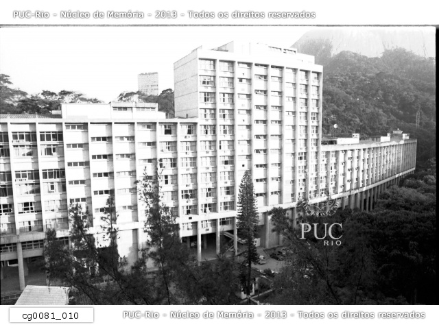 cg0081_010 | 1980 | Edfício Cardeal Leme visto da Ala Frings, tendo ao fundo o Morro dois Irmãos. |