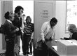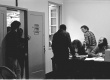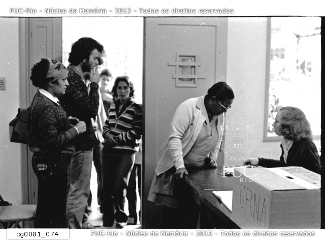 cg0081_084 | 1979 | Eleições para diretoria da Associação dos Funcionários da PUC-Rio. Pessoas na entrada da Associação. Pela primeira e única vez concorreram três chapas: Renovação, União e Novas ideias. |