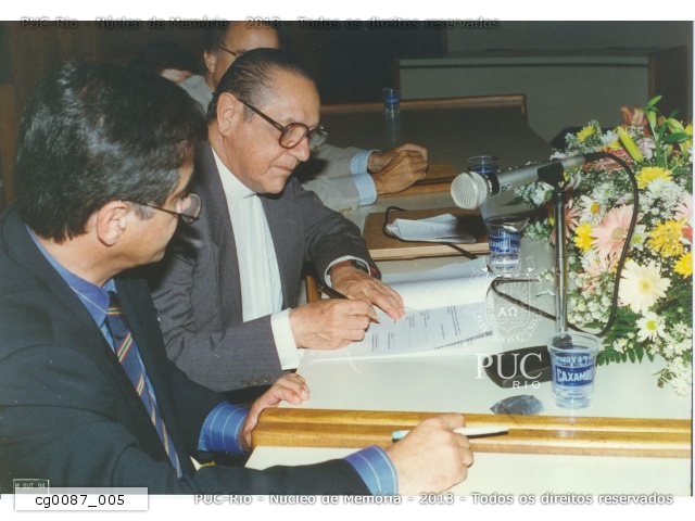 cg0087_013 | 7/10/1994 | Evento com a presença do Reitor Pe. Laércio Dias de Moura S.J., do Vice-reitor Acadêmico Pe.Jesús Hortal Sànchez S.J., do Presidente do Instituto Luíz de Camões e do Consul Geral de Portugal no Brasil. |
