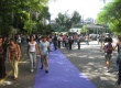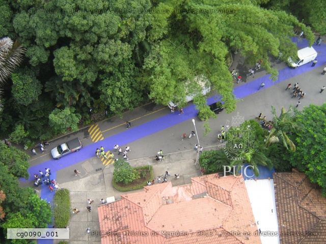 cg0090_002 | 18/4/2008 | Vista do alto do Ed. Cardeal Leme. Rua de acesso ao interior do campus com tapete roxo, casa do CCE, bosque e bicicletário além de movimentação de alunos e automóveis. |