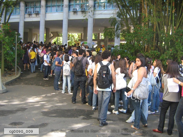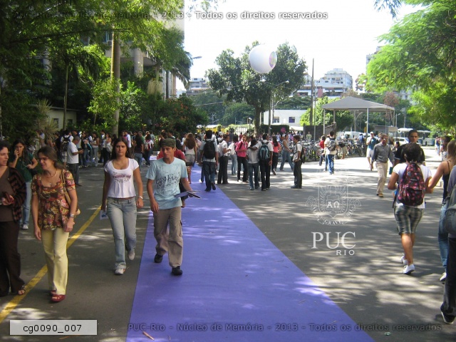 cg0090_008 | 18/4/2008 | Alunos chegando para as atividades. Balão do Portal PUC-Rio Digital. |