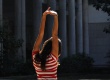 cg0100_015 | 8/2010 | Foto artística exibindo aluna sentada ao lado do Edifício da Amizade |