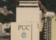 cg0100_021 | 2010 | Fotografia tirada do alto mostrando a frente do Edifício Cardeal Leme e o brasão da universidade |
