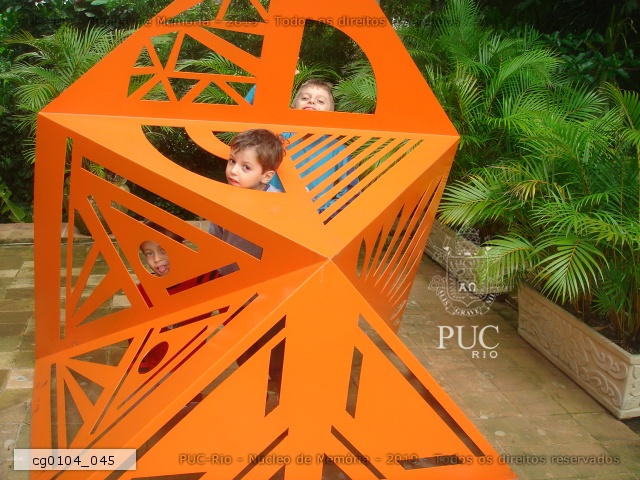 cg0104_045 | 13/11/2010 | Crianças em visita a Exposição PUC-Rio 70 anos interagem com escultura no pátio do Solar. |