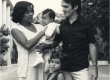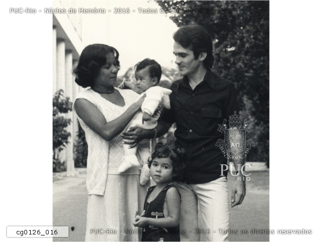 cg0126_016 | 1980 | Imagem produzida após o batizado do filho mais novo de Antônio, Luciano, realizado na capela que havia no térreo do Ed. Cardeal Leme. Luciano está no colo da mãe, Sra. Neuza Renovato. A outra filha, Bianca, que aparece à frente na foto, hoje é funcionária da Vice-Reitoria Administrativa. |