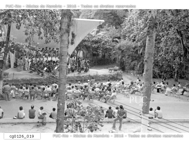 cg0126_019 | 1979 | Coral da PUC-Rio e orquestra de câmara em evento na antiga concha acústica da Universidade. |