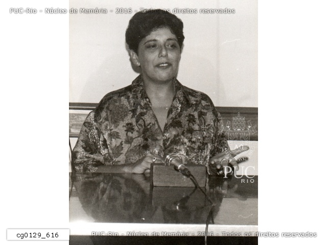 cg0129_616 | 3/5/1991 | Fotografia da jornalista e atriz Leda Nagle na PUC-Rio em evento não identificado. |