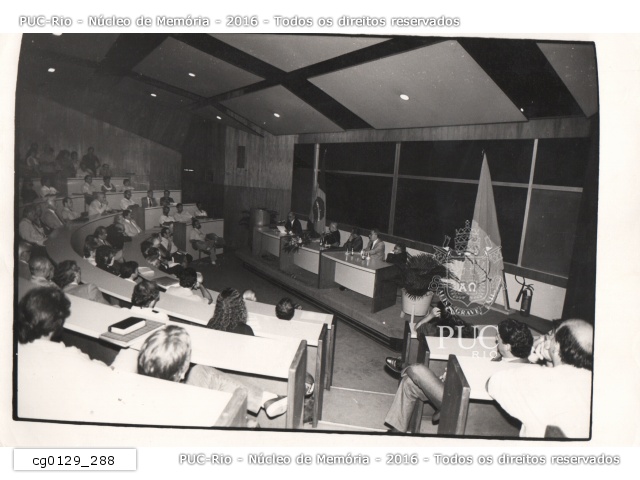 cg0129_288 | 18/3/1988 | Aula Magna com o tema A Universidade no Brasil e o desenvolvimento científico e tecnológico. O conferencista foi o ex-aluno e, à época, Presidente da Financiadora de Estudos e Projetos (Finep), Fábio Celso Macedo Soares Guimarães. Fizeram parte da mesa o Cardeal Arcebispo do Rio de Janeiro Dom Eugênio Salles, o Reitor Padre Laércio Dias de Moura e o Subsecretário de Educação do Estado Wilmar Garcia Barbosa. |