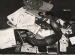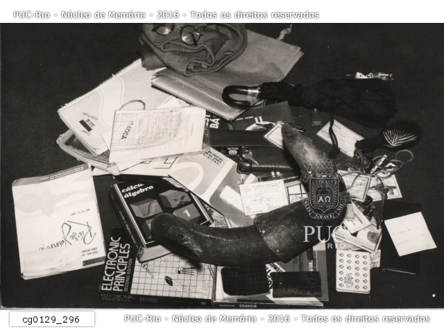 cg0129_296 | 30/7/1991 | Objetos perdidos no campus da PUC-Rio e que foram entregues ao setor de Achados e Perdidos da Prefeitura. Entre eles está um chifre de boi, encontrado no estacionamento da Universidade. |