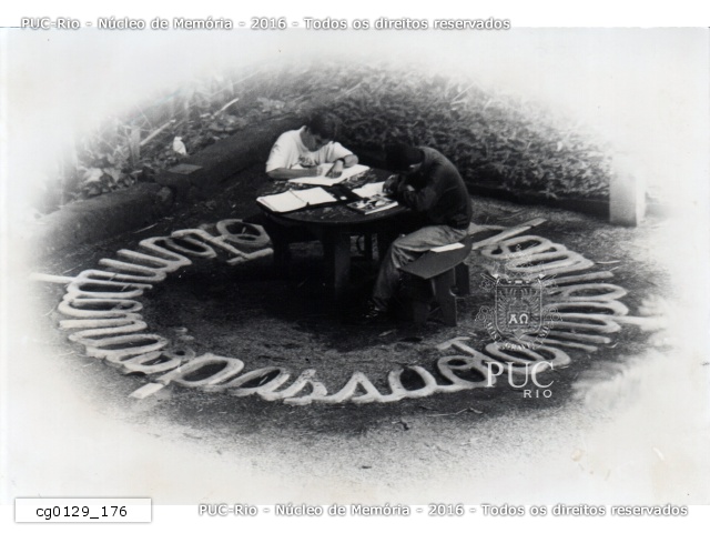 cg0129_176 | 1997 | Alunos estudam onde estava exposta a obra, com os dizeres "...otemponãopassa...", da escultora Lia do Rio, como parte do Museu ao Ar Livre, da PUC-Rio. |