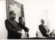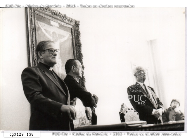 cg0129_138 | 1995 | O pe. Jesús Hortal Sànchez S.J. ao lado do reitor pe. Laércio Dias de Moura S.J. em evento na sala do Conselho Universitário. |