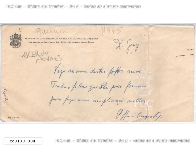 cg0133_004 | 1965 | Envelope onde estavam os negativos, no acervo do Prof. Paulo Novaes, com recado do Pe. Hainberger S.J. para a Sra. Geny. |