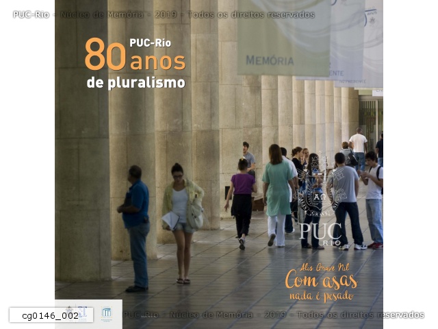 cg0146_009 | 13/2/2020 | Painel instalado nos pilotis do Edifício Cardeal Leme, no Bloco B, com asas referentes ao lema da Universidade, "Com asas nada é pesado", composta por fragmentos de imagens de pessoas nos pilotis. |