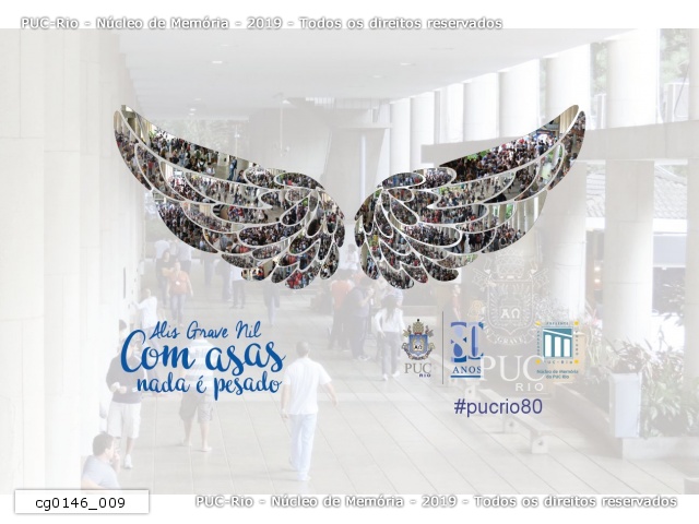 cg0146_008 | 13/2/2020 | Painel instalado nos pilotis da Ala Frings, com asas referentes ao lema da Universidade, "Com asas nada é pesado", composta por fragmentos de imagens de prédios e do céu da PUC-Rio. |