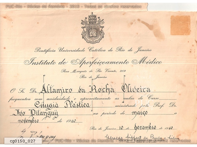 cg0150_027 | 10/12/1960 | Diploma de conclusão de curso de Cirurgia Plástica ministrado pelo prof. Ivo Pitanguy, emitido em nome de Altamiro da Rocha Oliveira. Assinado pelo prof. Ivo Pitanguy e pelo prof. Geraldo Siffert de Paula e Silva. |