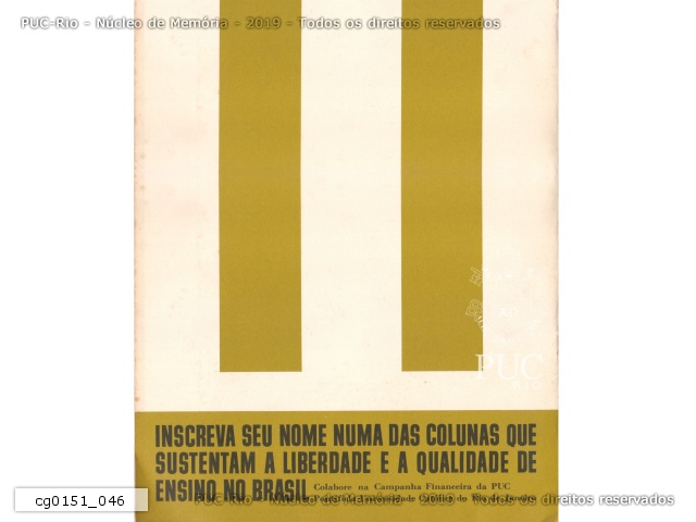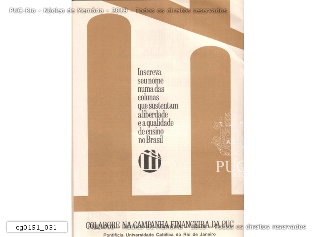 Página do folder de divulgação da Campanha Financeira "Seja mais uma coluna da PUC". "Inscreva seu nome numa das colunas que sustentam a liberdade e a qualidade de ensino no Brasil". |