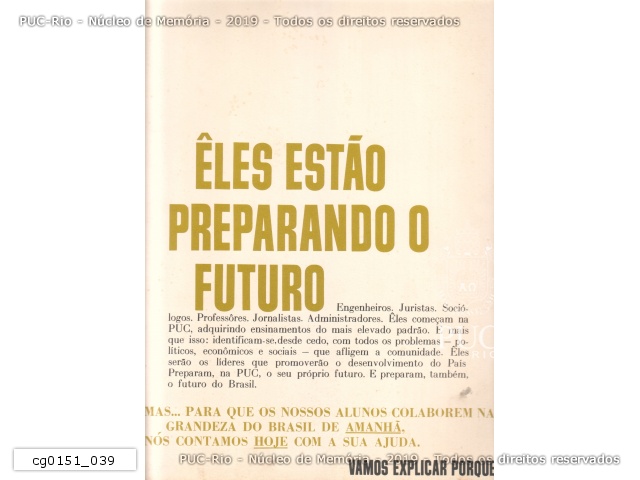 Página do folder de divulgação da Campanha Financeira "Seja uma coluna de apoio da PUC". "Eles estão preparando o futuro", "Mas, para que os nossos alunos colaborem na grandeza do Brasil de amanhã, nós contamoso hoje com a sua ajuda". |