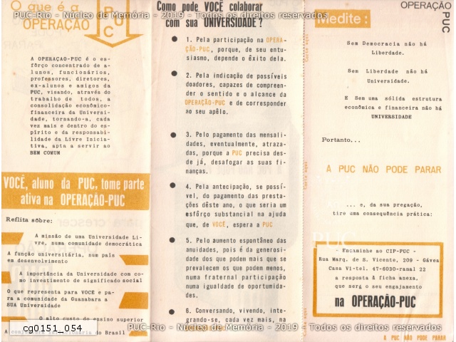 Parte interna do folder da Campanha Financeira da PUC-Rio, denominada neste ano de "Operação-PUC". Convoca os alunos a participarem do esforço financeiro da Universidade, por conta da "conjuntura inflacionária" e através da "indicação de possíveis doadores", pelo pagamento das mensalidades atrasadas, pela "antecipação, se possível, do pagamento das prestações deste ano" e "Pelo aumento espontâneo das anuidades, pois é da generosidade dos que podem mais que se prevalecem os que podem menos". |