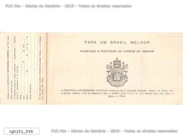 Recibo de doação para a Campanha Financeira da PUC-Rio, com o lema "Ajude-nos a preparar os homens de amanhã". |