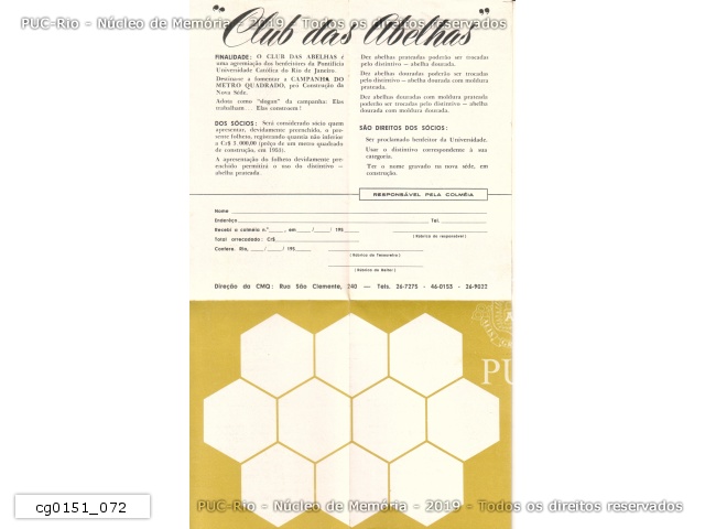 Capa do folder da campanha de arrecadação de fundos para a construção do Campus Gávea, com o lema "Elas trabalham... elas constroem", e a figura de uma trama de casulos. Finalidade do "Club das Abelhas", "uma agremiação dos benfeitores" da PUC-Rio, destinada a fomentar a "Campanha do Metro Quadrado". Ficha de cadastro de membro da "Colmeia". |