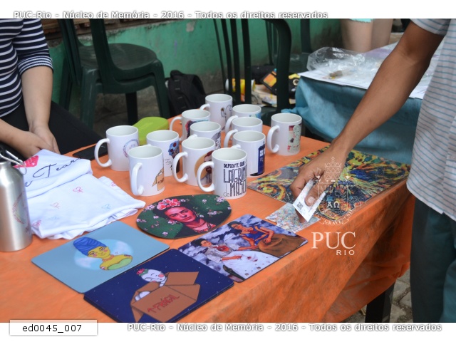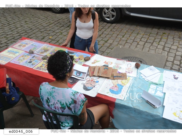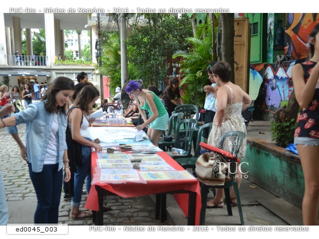 Feira de artes gráficas feministas realizada na Vila dos Diretórios durante a "Semana do Dia Internacional da Mulher PUC-Rio", organizada pelo Centro Acadêmico de Ciências Sociais da PUC-Rio, CASOC.