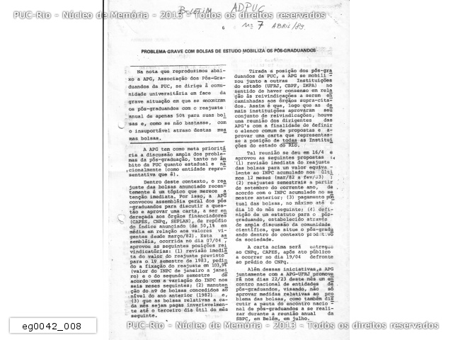 eg0042_008 | 4/1989 | Boletim da ADPUC no. 7 - Problema grave com bolsas de estudo mobiliza os pós-graduandos. Nota da APG à comunidade universitária sobre os atrasos nas bolsas e os reajustes muito abaixo da inflação. |