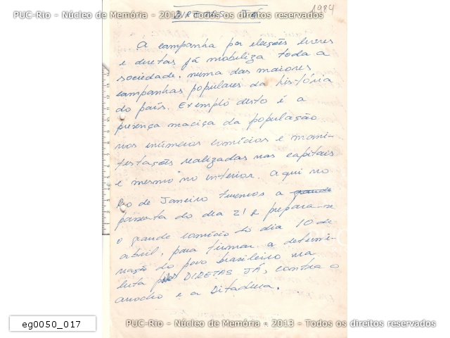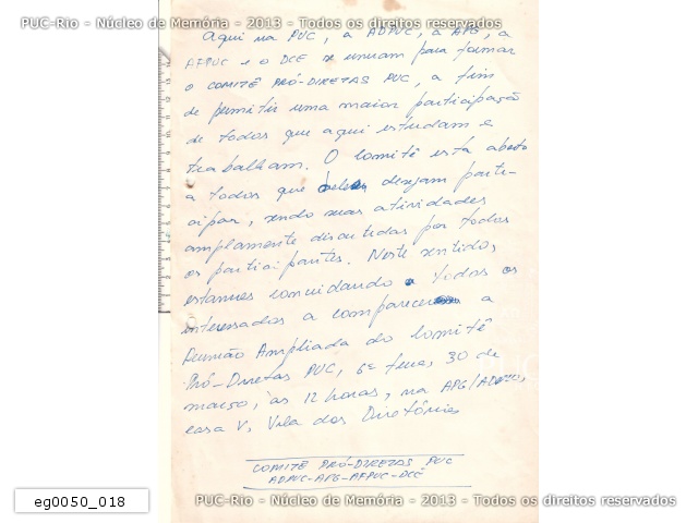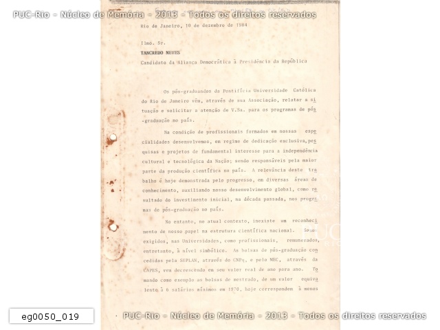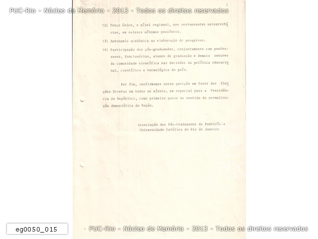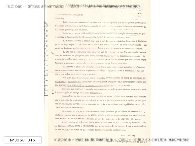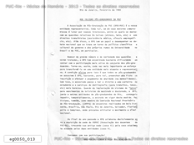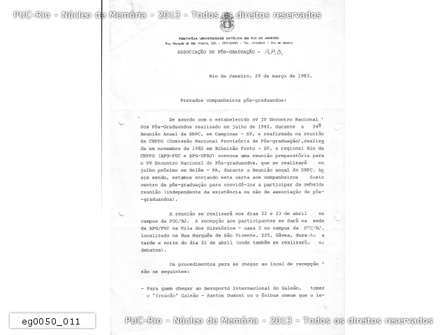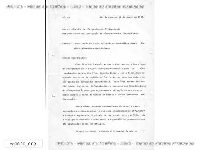 Tratam de assuntos variados, como encontros e correspondências com a Coordenação Nacional Provisória de Pós-Graduandos, solicitação encaminhada ao governador Leonel Brizola sobre a utilização de um prédio, agradecimento ao Reitor da PUC-Rio Pe. Laércio de Moura pelo encontro com a CNPPG, debate sobre o índice de reajuste das bolsas de estudo, convocação para Assembleia geral dos Pós-Graduandos, reunião preparatória para o V Encontro Nacional de Pós-Graduandos, dificuldades da participação de Pós-Graduandos na APG, sugestões dos Pós-Graduandos da PUC-Rio para a política educacional e sobre a situação da Pós-Graduação no país, carta para a comunidade acadêmica sobre a nota atribuída ao Mestrado em Psicologia, campanha sobre as Diretas Já, e carta para o candidato à presidência Tancredo Neves sobre o reconhecimento da Pós-Graduação no Brasil.