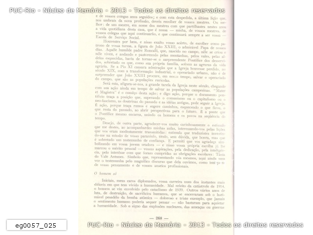 eg0057_024 | 12/1961 | Continuação do discurso de paraninfo pronunciado pelo prof. Nélio Reis aos diplomandos da faculdade de Direito. Início do discurso de paraninfo pronunciado pelo prof. Manuel Diegues Junior aos diplomandos de Serviço Social. |