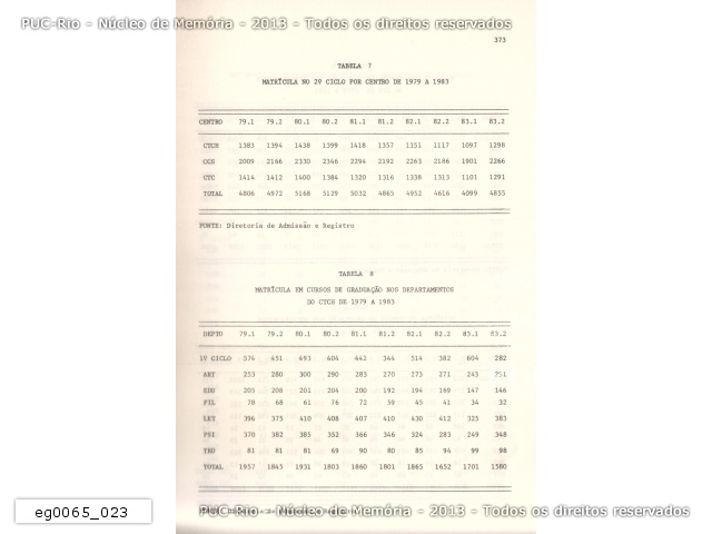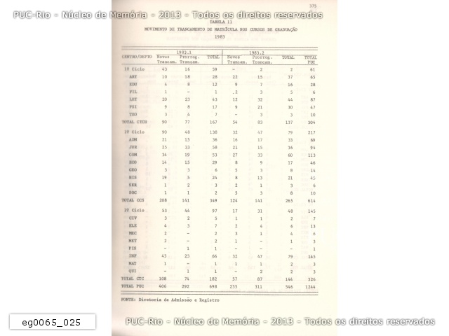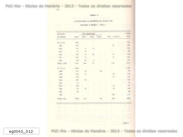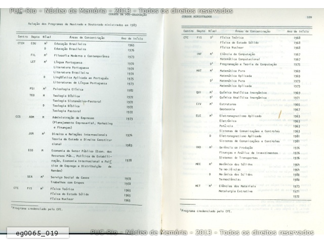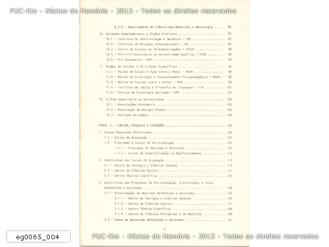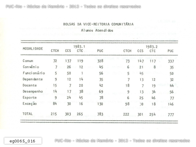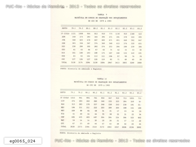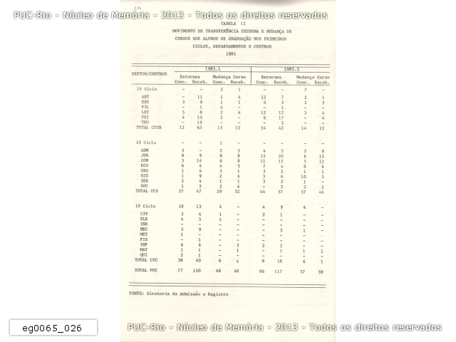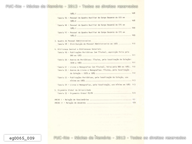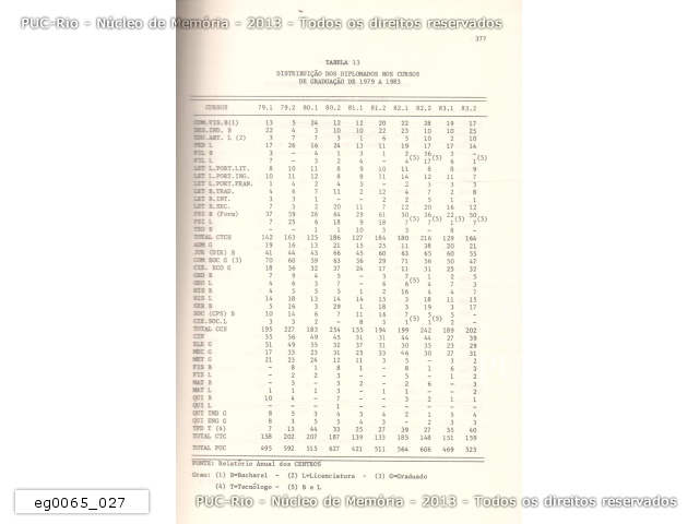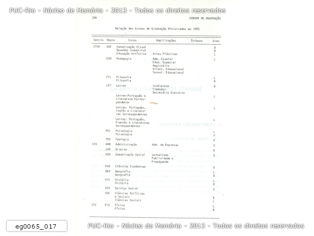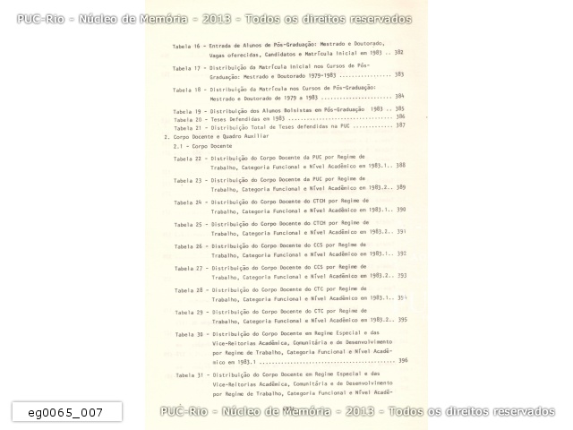 Balanço do ano de 1983 da Pontifícia Universidade Católica do Rio de Janeiro. Possui organogramas dos Centros, gráficos com a quantidade de alunos matriculados na graduação e na Pós-Graduação, informações sobre os Departamento, linhas de pesquisa, seminários, publicações periódicas, Pós-Graduação, além da relação dos professores e dos funcionários.