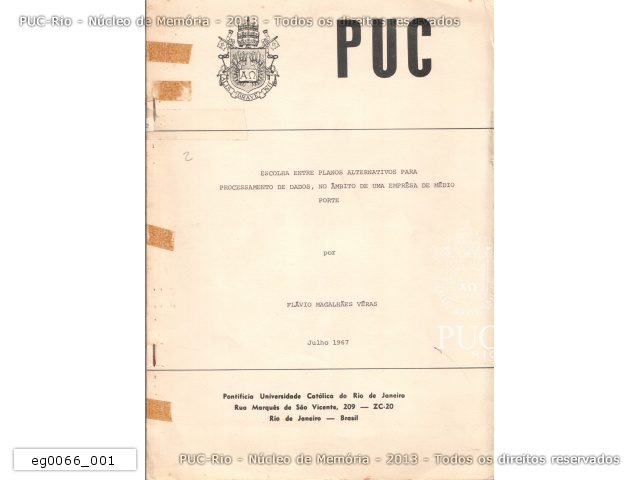 eg0066_001 | 7/1967 | Capa da primeira dissertação de Mestrado defendida no Programa de Pós-graduação em Engenharia de Produção: Escolha entre planos alternativos para processamento de dados, no âmbito de uma empresa de médio porte, por Flávio Magalhães Véras. |
