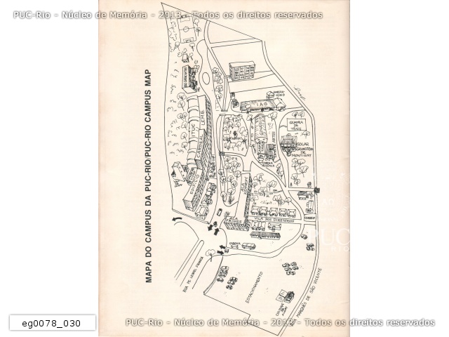eg0078_030 | 1991 | Mapa esquemático do campus Gávea. Mostra os locais do Salão de Vidro, do ponto de carona, da quadra de tênis, do antigo ambulatório, entre outros. |