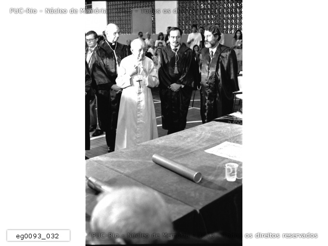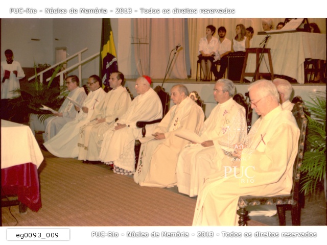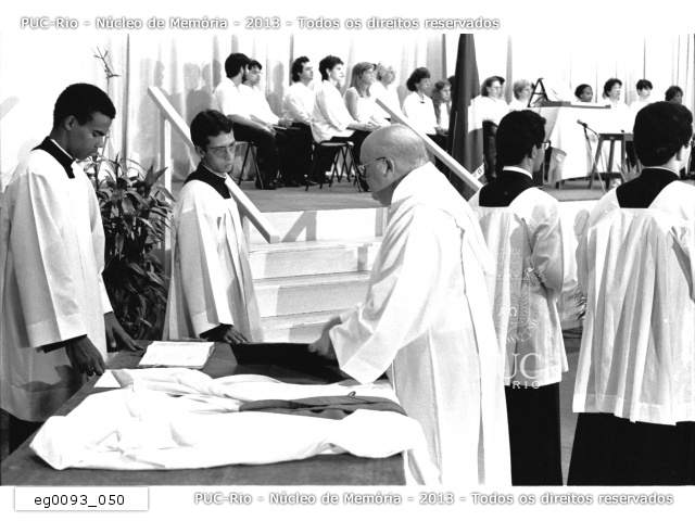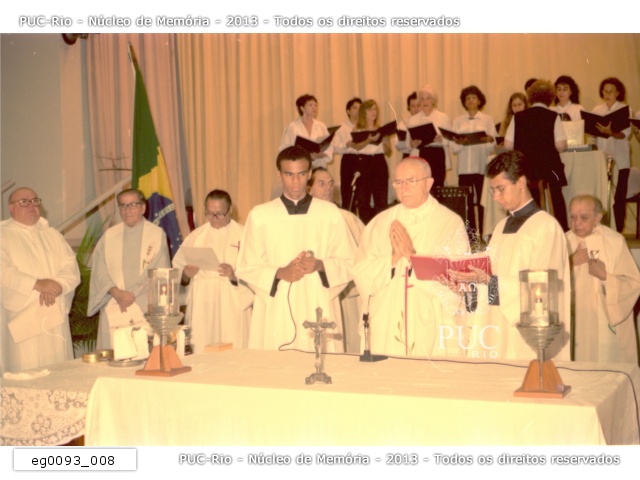 Série de fotografias digitalizadas do acervo de negativos em preto e branco do Projeto Comunicar e de slides coloridos do acervo da Reitoria da PUC-Rio. As imagem registram a Missa de Ação de Graças em homenagem aos 50 anos da PUC-Rio, celebrada pelo cardeal arcebispo do Rio de Janeiro e Grão-Chanceler da PUC-Rio, dom Eugênio Sales, e a cerimônia que concedeu o título de Doutor Honoris Causa ao padre Dom Helder Camara e ao advogado Sobral Pinto.