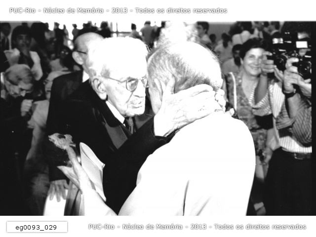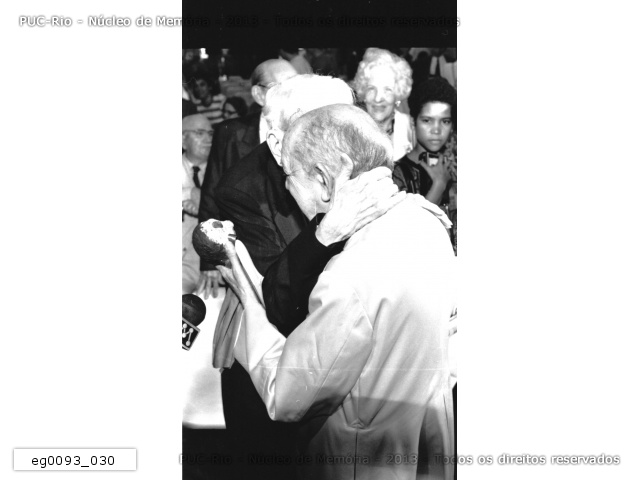 eg0093_030 | 22/3/1991 | O advogado Sobral Pinto e dom Helder Camara se cumprimentam na cerimônia que concedeu aos dois o título de Doutor Honoris Causa pela PUC-Rio. |
