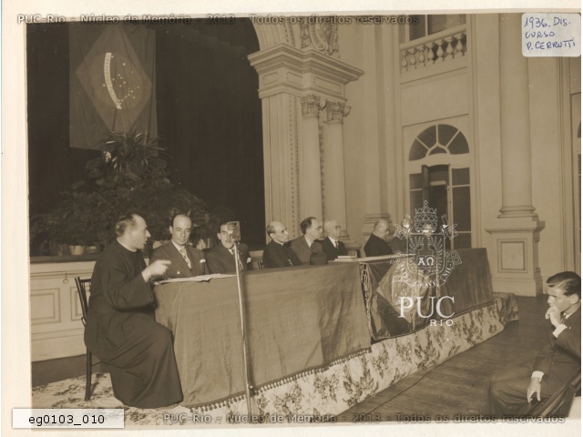 eg0103_010 | 1936 | Pe. Pedro Cerruti, S.J., em uma mesa com professores e autoridades, discursa no auditório do Colégio Santo Inácio durante aula do curso de Filosofia. |
