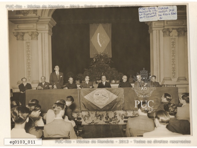 eg0103_011 | 1936 | Carlos José de Assis Ribeiro discursa em uma mesa com professores e autoridades no auditório do Colégio Santo Inácio, durante o encerramento do do curso de Filosofia do pe. Pedro Cerruti, S.J. |